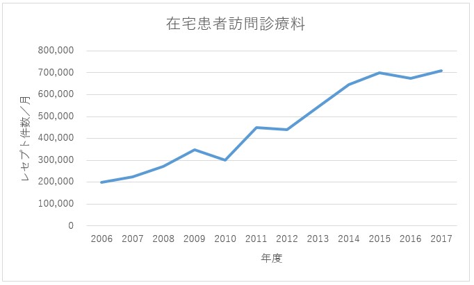 2015年3月に示された地域医療構想策定ガイドラインに、「今後、高齢化により増大する医療需要に対応するためには、病床の機能の分化及び連携により、平成37 年(2025 年)には、現在の療養病床以外で対応可能な患者は在宅医療等での対応を促進するとともに、在宅医療等の充実を支援していくことが必要である」とあるように、在宅医療の充実を目指す方向性が示された。また、患者宅に計画的・定期的に訪問して診療を行うことに対する診療報酬点数である、「在宅患者訪問診療料」のレセプト件数は年々伸びている=グラフ1=。