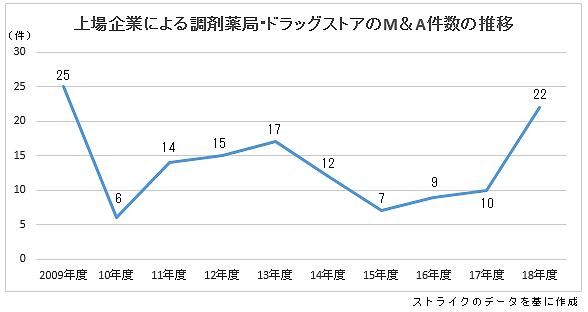 2018年度の株式上場企業による調剤薬局・ドラッグストアのM&A件数は22件で、過去10年間で2番目に多いことが、M&A仲介業のストライク(東京都千代田区)の集計結果で分かった。一方、その総額は直近ピーク時の16年度の4分の1以下に落ち込んでおり、成約件数は伸びているものの、1件当たりの金額が小規模という実態が浮き彫りになった。【松村秀士】