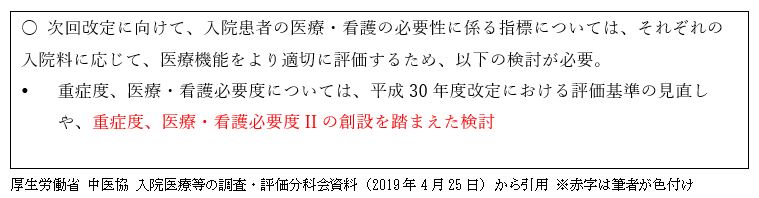 4月までの中央社会保険医療協議会の議論で出てきた検討の方向性から、看護必要度への影響を考えると、中医協総会で示された「年代別」の議論に留意すべきである。