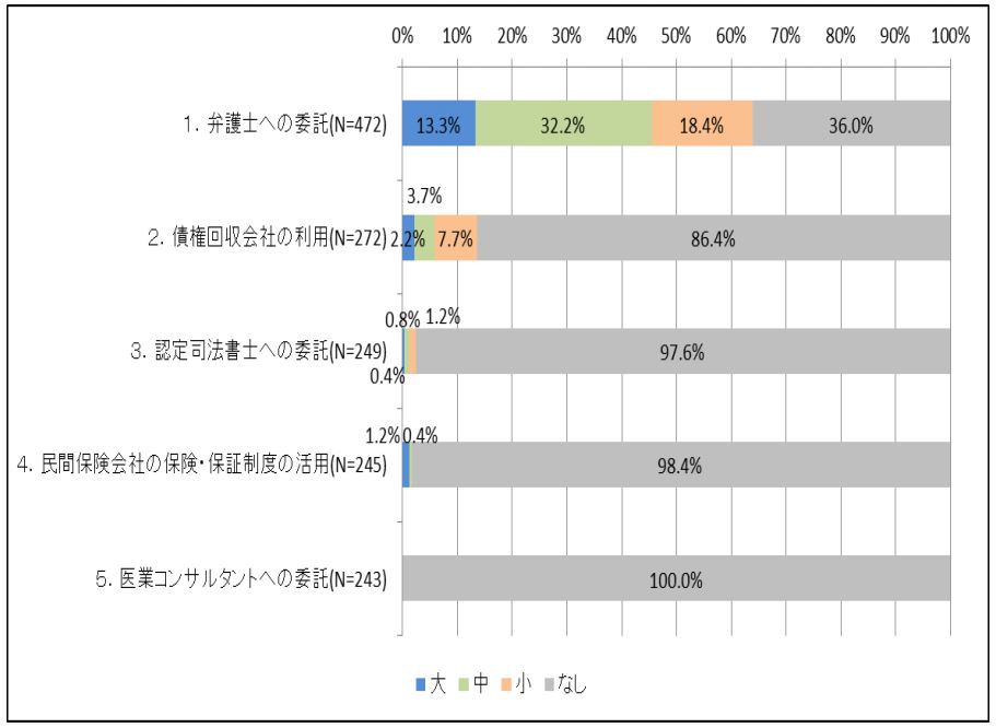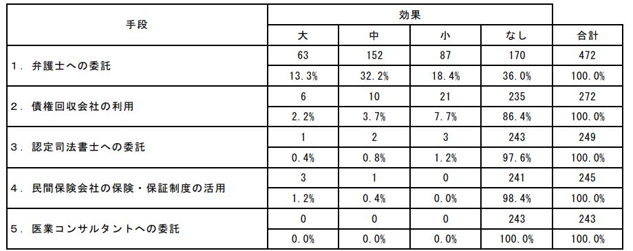 未収金回収対策の外部委託における手段と効果について、「弁護士への委託」を手段とする回答が最も多かったが、効果が「大」は13.3%、「なし」は36.0%だった=資料=。他の手段においても、効果が「なし」は8割以上で、特に「医業コンサルタントへの委託」は100%だった。未収金が発生した場合の回収の困難さがうかがえる。