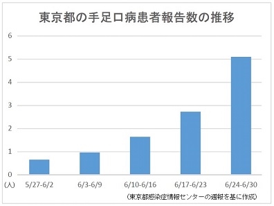 6月24日から30日までの週の1医療機関当たりの患者報告数は、前週比約1.9倍の5.1人となった。年齢別では1歳が最も多く、3歳未満が全体の8割を占めている。 手足口病の流行拡大に伴い、患者報告数が警報基準値(5.0人)を上回る保...