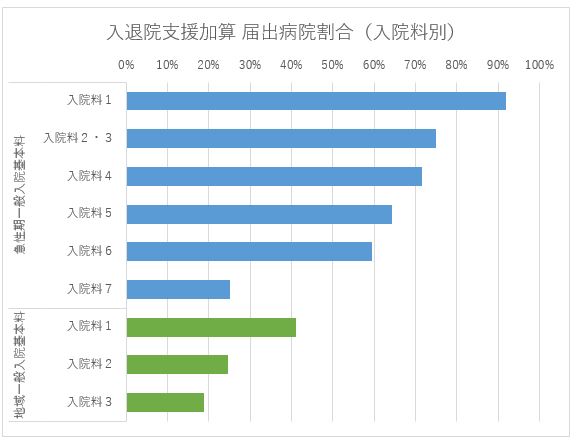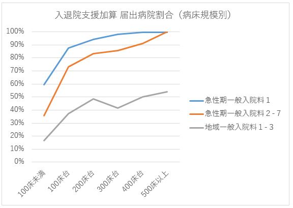 もし、自院が急性期一般入院基本料の病棟を有する病院で、現時点で入退院支援加算の届出をしていないのであれば、それはかなりの少数派に属していると認識すべきだろう。中小病院であれば致し方ないとも言えるが、グラフ1、2の数値を参考に取り組みを検討すべきかもしれない。