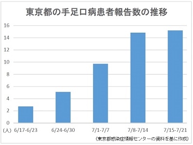 東京の手足口病患者報告数、警報基準値の3倍超に