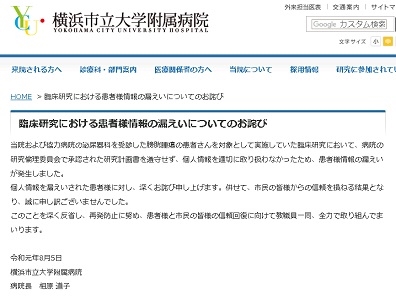 患者情報漏えいに関する「お詫び」を掲載した横浜市立大附属病院ホームページ
