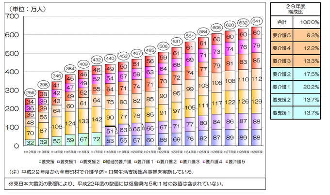 要介護・要支援認定を受けた人の内訳は、要支援1・2がそれぞれ約88万人、要介護1が約129万人、同2が約112万人、同3が約85万人、同4が約79万人、同5が約60万人となっている=グラフ=。