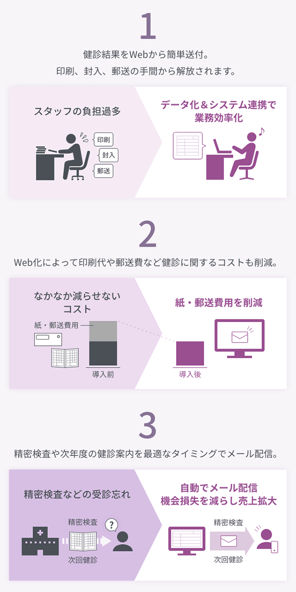 紙の結果票を郵送するまでの工程が不要になり、スタッフの作業時間も短くなった。作業に必要だった人件費が抑えられ、印刷費や郵送費も大きく減った。