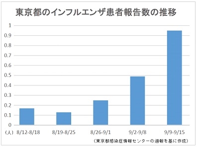 週報によると、9日から15日までの週の1医療機関当たりの患者報告数は、前週と比べて約2倍の0.95人となった。年齢別では、10歳未満が全体の6割超を占めている。 都内の全31保健所管内のうち、▽文京(3.14人)▽中央区(2.6人)▽北...