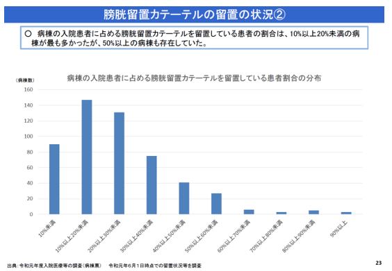 10月3日の中央社会保険医療協議会の「入院医療等の調査・評価分科会」において、療養病棟における膀胱留置カテーテルの留置状況に関するデータが示された。