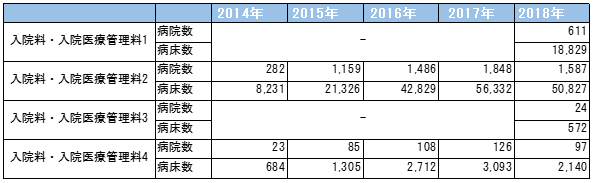 2014年度診療報酬改定で地域包括ケア病棟が評価されてから、「重症度、医療・看護必要度」(以下、看護必要度)の厳格化等の影響もあり、病棟は順調に増加してきた=表1=。