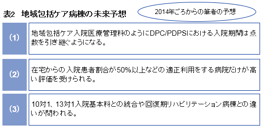 私は14年度の病棟新設当時から、地域包括ケア病棟の未来予想のスライド=表2=を講演会等で一貫して使ってきた。評価された当初はバラ色の未来と感じた方もいるだろうが、いい時はそう長くは続くまいと考えてきた。