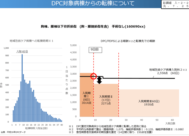 とはいえ、図2に示すように、あるタイミングでの転棟が多く、かつ自院の急性期病棟からの転棟が多くを占める現実からすれば、“おいしいとこ取り”をする医療機関が多く、DPC/PDPSの点数を引き継ぐことは、どこかのタイミングでは、自然な流れではないだろうか=グラフ3=。