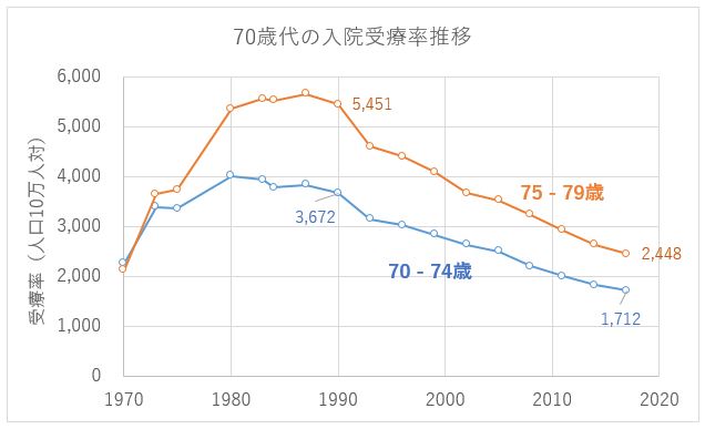 しかし70歳代の入院受療率に着目すると、70歳代前半も70歳代後半も30年近く減少し続けている=グラフ2=。グラフの傾向だけで考えるならば、今後も受療率は減少し続ける可能性を示唆している。そのため、経営に何らかの影響があると認識すべきだろう。