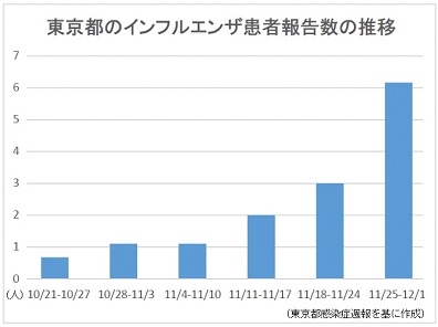 インフルエンザ情報によると、この週の患者報告数は、2018年の同期(0.94人)と比べて約6.6倍の規模となっている。保健所管内別では、荒川区(15.0人)と目黒区(12.88人)で注意報レベル(10.0人)を超えた。 インフルエンザの...