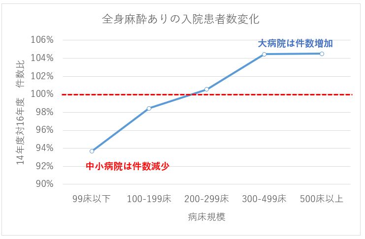 看護必要度の厳格化や、DPC/PDPS制度の階段状の点数、機能評価係数IIの効率性係数など診療報酬制度の変化に応じ、病床規模に関係なく急性期病院が高回転化を促されている。しかし、高回転化を進め新入院患者の確保がままならなければ、利用率は低下し、一般的には経営が厳しくなる。新入院患者確保が重要なことは自明のことであるが、全身麻酔患者においては、大病院ほど患者数を増やしやすく、中小病院には患者確保が厳しいという現実が透けて見える。