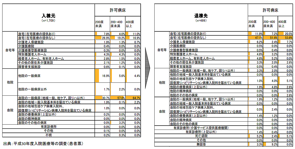 地域包括ケア病棟入院料と地域包括ケア入院医療管理料では、入院患者全体に占める院内での転棟患者の割合に制限を設ける。許可病床が一定程度の病院を対象に想定している。許可病床の規模が大きい病院ほど、地域包括ケア病棟の患者の入棟元は「自院の一般病床」の割合が高く、「他院の一般病床」の割合が低いことが、中医協の「入院医療等の調査・評価分科会」(入院分科会)が18年度に行った調査で分かったため。