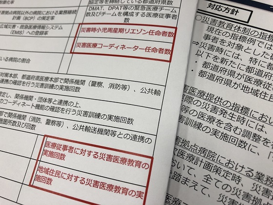 医療計画の指針では、災害医療コーディネート体制の構築・要員の育成を求めており、「災害医療コーディネーター」と「災害時小児周産期リエゾン」については、2019年2月に活動要領が策定され、位置付けが明確化された。