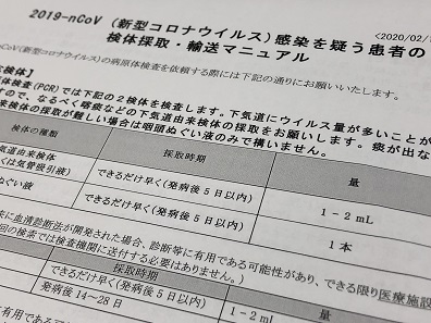 国立感染症研究所が公表した「2019-nCoV(新型コロナウイルス)感染を疑う患者の検体採取・輸送マニュアル」