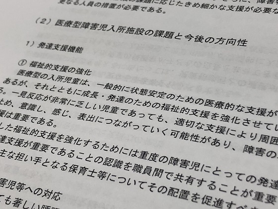 報告書では、医療型の発達支援機能について、▽福祉的支援機能の強化▽強度行動障害児等への対応▽医療的ケア児への対応▽教育と福祉の切れ目のない連携▽家庭的な養育環境の推進-に分けて課題や今後の方向性を示している。