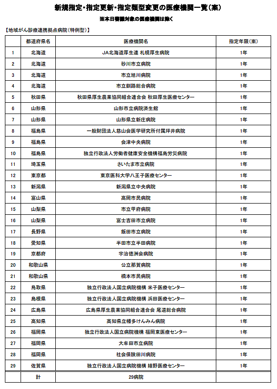 19日の会合で厚労省は、東京医科大八王子医療センターやさいたま市立病院、札幌厚生病院など29病院=表=を4月1日から「特例型」とすることを提案し、了承された。ただ、このうち、さいたま市立病院と市立旭川病院、福岡東医療センターの3カ所は、国立がん研究センターが実施する研修での「中級認定者」(院内がん登録の実務担当者)を3月末までに配置すれば要件を満たすことになり、従来の「一般型」のまま指定される。