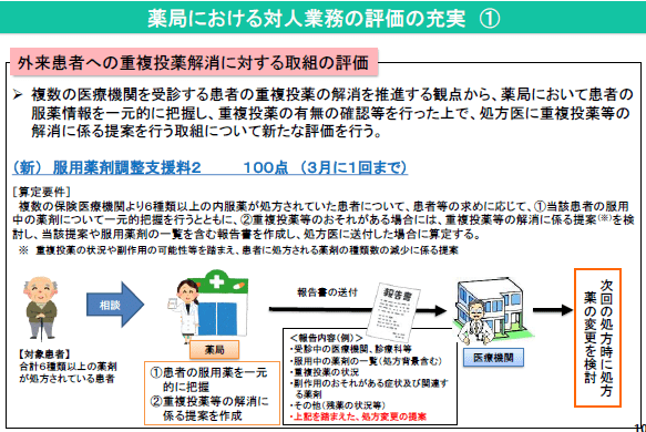 今回改定も、多剤・重複投薬の解消は大きなテーマといえます。厚労省では、さまざまな方法で解消を図るようです。