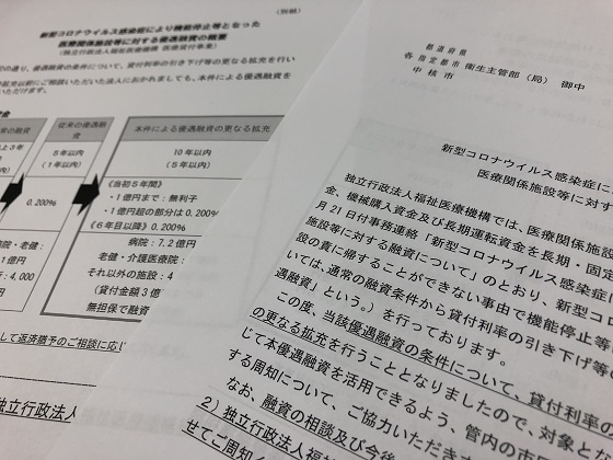 事務連絡では、独立行政法人福祉医療機構が、医療関係施設などを整備する際に必要となる建築資金、機器購入資金、長期運転資金などを長期・固定・低利で融資していることに触れ、機能停止になった場合の運転資金については、「通常の融資条件から貸付利率の引き下げ等の優遇措置を講じた融資」を行っていることを説明している。