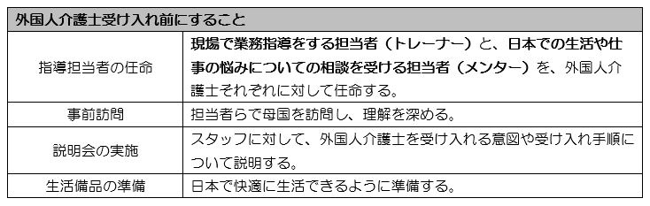 だからといって、やみくもに動いても徒労に終わるだけかもしれません。そこで私は、外国人介護士が入社する2-3カ月前から、以下の4点に着手するようにアドバイスしています。
