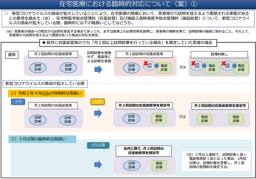 しかし、感染が拡大している間の限定した措置として、この4月に限って電話などで診療すれば訪問診療を行ったものとみなす。ただし、5月以降は、医師が1カ月に訪問診療と電話での診療を1回ずつ行えば「月2回訪問」の在医総管などを同月に限り算定できるが、2カ月以上連続してこの組み合わせの診療を行った場合、2カ月目以降は通常通り、「月1回訪問」の在医総管などを算定することになる。