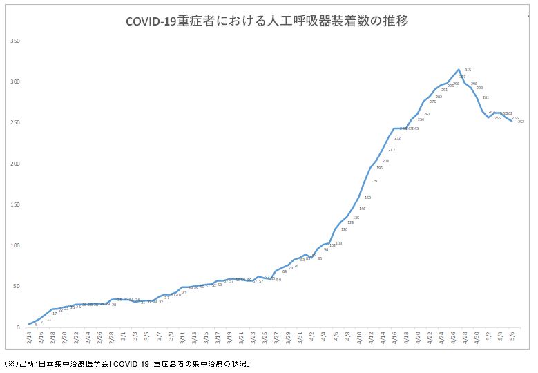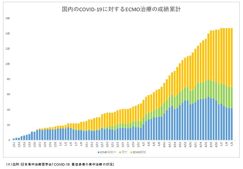グラフ1は、COVID-19重症者における人工呼吸器装着数の推移を見たもので、増加傾向にあったが4月27日を境に減少に転じている。さらに、COVID-19重症者におけるECMO装着数の推移を見ても同様の傾向にあり=グラフ2=、集中治療が必要な患者は4月27日にピークアウトしたという見方もできる。グラフ3は、国内のCOVID-19に対するECMO治療の成績累計であり、残念ながら一定の死亡患者はいるが、それ以上にECMO離脱者が増加しており集中治療の成果が表れている。