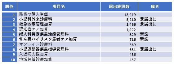 届出施設数の多い10項目には、小児科外来診療料や救急医療管理加算のような新たに届出が必要となった項目や、婦人科特定疾患治療管理料やせん妄ハイリスク患者ケア加算のような新設項目も挙がった。また、酸素の購入価格のように届け出し直すことが必要な項目も上位に挙がった(届出施設数の多い11-50位までは本稿最後の表2を参照)。