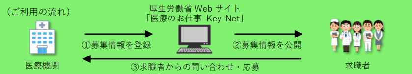 厚労省が開設するのは、「医療のお仕事Key-Net」。これを利用する医療機関は、国の「新型コロナウイルス感染症医療機関等情報支援システム」(G-MIS)にあらかじめ募集情報を登録する必要がある。その情報は「医療のお仕事Key-Net」で公開され、これを見た求職者が医療機関に問い合わせや応募をする流れとなる。