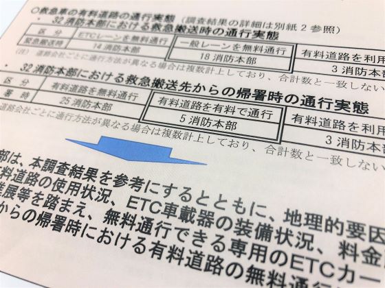 総務省はこのほど、「行政評価局レポート」を公表した。有料道路で料金を徴収されないで通行できる救急車(救急業務に際しての通行)に関する調査結果を記載。抽出調査した32消防本部のうち、18消防本部が救急搬送時に一般レーンを走行していたことや、5消防本部が救急搬送先からの帰署時に有料道路を有料で通行していたことを取り上げ、「無料通行できる専用のETCカードの活用や、救急搬送先からの帰署時における有料道路の無料通行について検討する必要がある」としている。【新井哉】