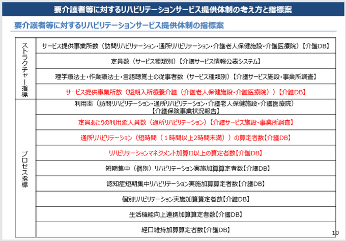 厚労省はこの日、これまでに集約した意見などを基に、「要介護者等に対するリハビリテーションサービス提供体制の指標」「介護保険事業(支援)計画における要介護者等に対するリハビリテーションサービス提供体制の構築に関する手引き」、検討会としての「報告書」の各案を示した。