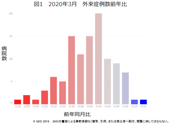 まずは外来への影響だ。この2カ月間の症例数を前年と比較すると、新型コロナの拡大がまだ限定的だった3月の時点で8割ほどの病院で減少し、中には20%以上減ったケースもある=図1=。都市部などで感染が急速に広がった4月には分析を行ったほぼ全ての病院で外来症例が減り、3月に比べて減少幅も拡大した。全病院の8割超で10%以上減少し、減少幅の最大値は40%ほどだった。