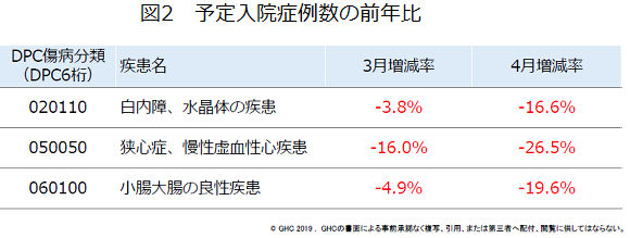 一方、入院の症例数は、全病院の平均で3月が4.0%、4月が15.4%の共に減だった。特に200床台の病院では4月に19.1%と2割近くも減少している。予定入院の症例が多い診断群分類をピックアップして分析すると、4月には「白内障、水晶体の疾患」が16.6%、心臓カテーテル検査などの「狭心症、慢性虚血性心疾患」が26.5%、内視鏡的大腸ポリープ切除術(大腸ポリペク)などの「小腸大腸の良性疾患」が19.6%のいずれも減と、「比較的待てる」手術や検査がそれぞれ減少した=図2=。
