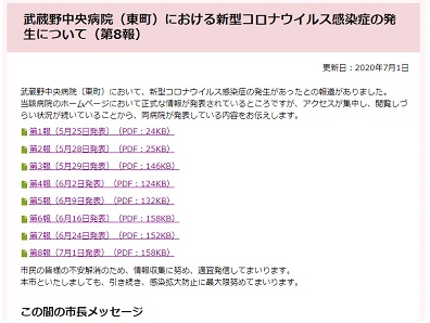 武蔵野中央病院の新型コロナウイルス感染症の発表内容(第8報)を掲載した小金井市のホームページ
