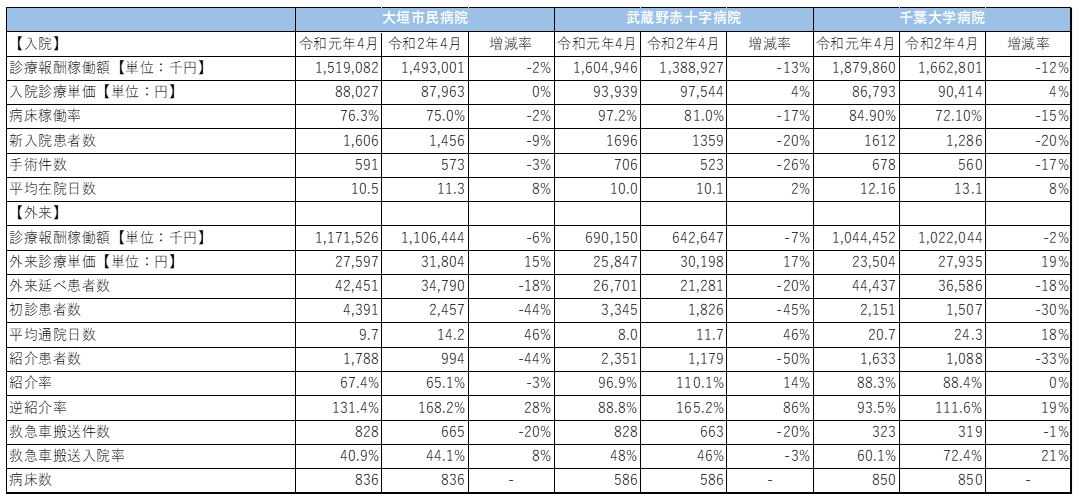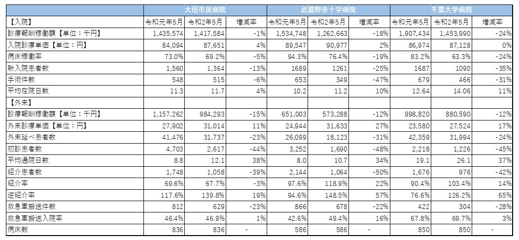 表1は、本連載でこれまでに取り上げた、3つの高度急性期病院の5月の診療実績である。4月とおおむね傾向は変わらないものの、より悪化しているのが一般的であるが、地域差の影響は出ているようだ=表2=。