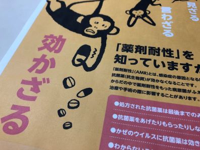 「見ざる 言わざる 効かざる」などのフレーズを盛り込んだ薬剤耐性(AMR)に関するポスター