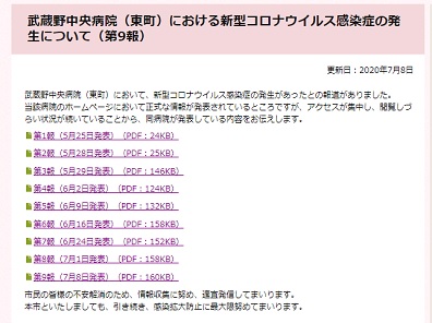 武蔵野中央病院の新型コロナウイルス感染症の発表内容(第9報)を掲載した小金井市のホームページ