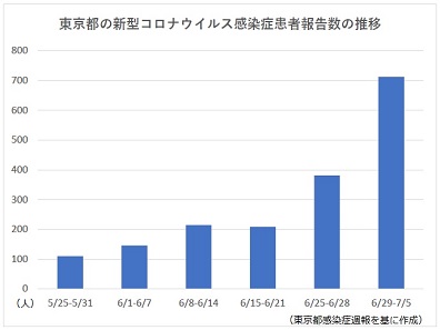 週報によると、6月29日から7月5日までの週(保健所受理週)の患者報告数は前週比331人増の712人(無症状病原体保有者120人を含む)。年齢別の患者報告数は20歳代が331人で最も多く、以下は、30歳代(170人)、40歳代(78人)、50歳...