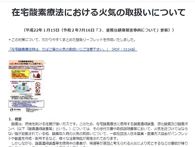 在宅酸素療法での火気の取り扱いに関する注意事項などを掲載した厚労省のホームページ