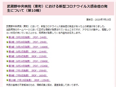 武蔵野中央病院の新型コロナウイルス感染症の発表内容(第10報)を掲載した小金井市のホームページ