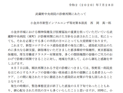 武蔵野中央病院の診療再開に関する小金井市長のメッセージ