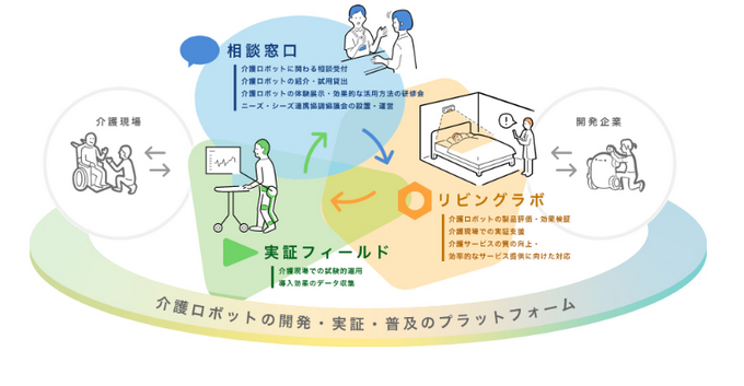 「介護ロボットの開発・実証・普及のプラットフォーム」構築事業では、介護ロボットの導入によって現場の業務効率化を目指す介護事業所と、介護ロボットの開発に向けてニーズの収集や効果検証を望む企業の双方の支援体制の確立を目指す。具体的には、「相談窓口」「リビングラボ」「実証フィールド」を整備することで、介護ロボットの開発、実証、普及の各段階における支援を行う=図=。