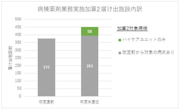 改定直前と直近の加算2の届け出状況を比較した=グラフ2=。改定前からの対象病床を有している病院は、改定を挟んで375病院から393病院に増えた。一方、ハイケアユニットしか対象病床を持たない病院からは改定後に58の届け出があった。つまり、これが急増につながった大きな要因と考えて間違いないだろう。