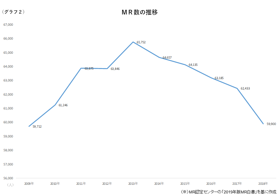 グラフ2は、国内でのMR数の推移を示したもの。それによると、MRは2013年の6万5,752人をピークに減少の一途をたどっており、5万人を下回るのは目前だ。