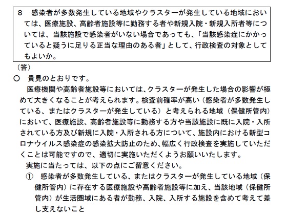 Q&Aでは、医療機関や高齢者施設などについて、クラスターが発生した場合の影響が極めて大きくなることが考えられると説明。「検査前確率が高い(感染者が多数発生している、またはクラスターが発生している)と考えられる地域(保健所管内)」では、医療施設や高齢者施設などに勤務している人、既に入院・入所している人、新規に入院・入所する人について、「施設内における新型コロナウイルス感染症の感染拡大防止のため、幅広く行政検査を実施していただくことは可能」などとしている。