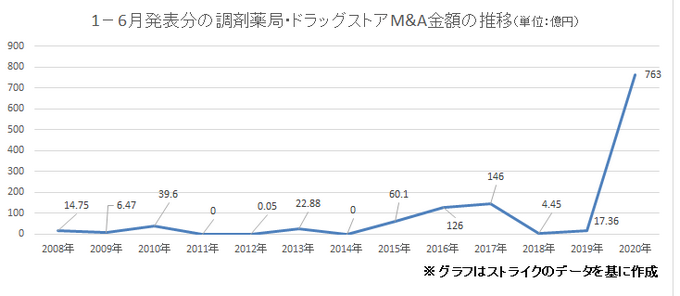 M&A仲介業のストライク(東京都千代田区)によると、2020年1-6月の調剤薬局・ドラッグストア業界のM&A発表件数は8件だった。同社がデータを持つ08年以降で3番目に多い。一方、取引金額は、総合メディカルホールディングス(福岡市)が、投資会社のポラリス・キャピタル・グループ(東京都千代田区)と組んで実施した経営陣による買収(MBO)で買付代金が763億円に達し、1-6月としては過去最高となった。このほかの7件は全て金額非公表。