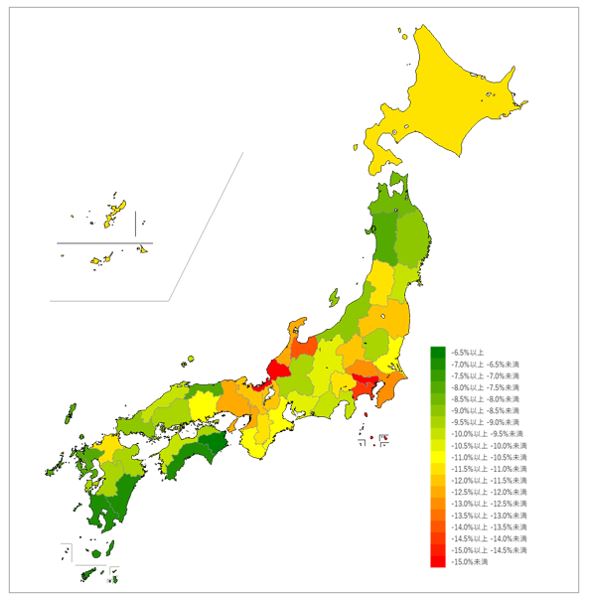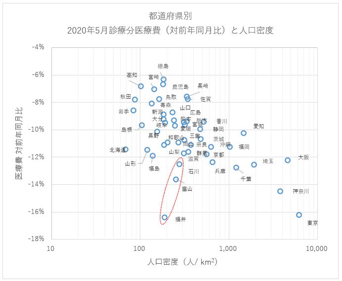赤色ほど減少幅が大きく、緑色ほど減少幅が小さいことを示している。東京と福井の減少幅が特に大きい。減少幅は都道府県間で最大10%程度の開きがあった。当然、地域で病院経営へのインパクトも大きく異なっているだろう。さらに、グラフ1の都道府県別の医療費の変化について、人口密度との関係を見た=グラフ2=。