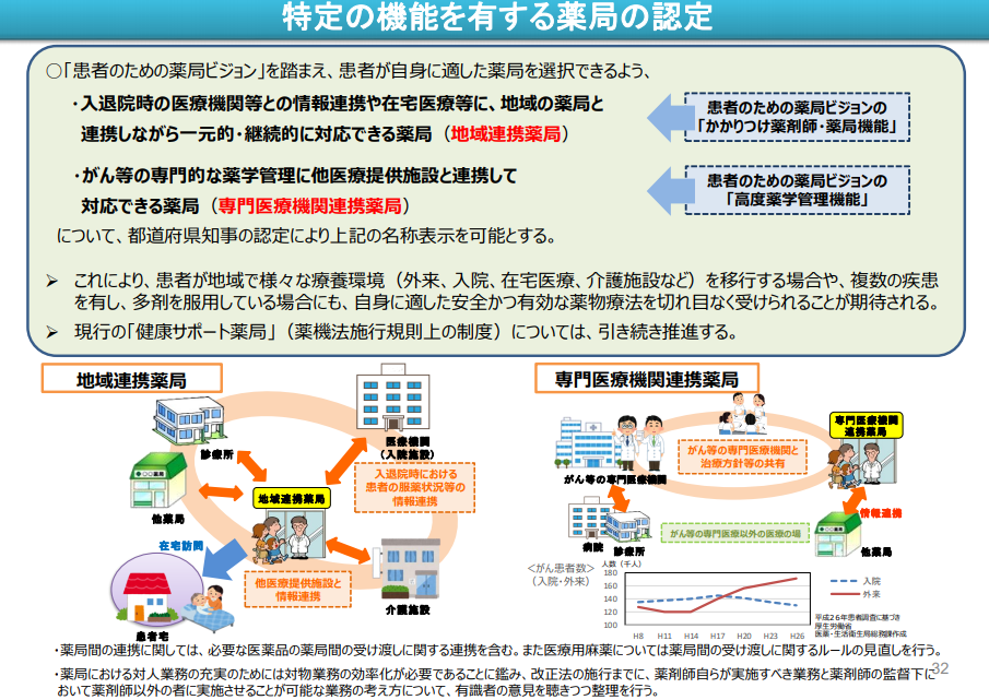 9月1日の改正薬機法の一部施行により、機能別の薬局の認定・表示制度が2021年8月から始まる。患者が自身に適した薬局を選択できるようにするのが目的で、都道府県知事から認定を受けるのは、▽入退院時や在宅医療に他の医療提供施設と情報共有や連携をして利用者に対応できる「地域連携薬局」▽がんなどの専門的な薬学管理について他の医療提供施設と連携して対応できる「専門医療機関連携薬局」-の2つ。認定には、一定の要件を満たす必要がある。