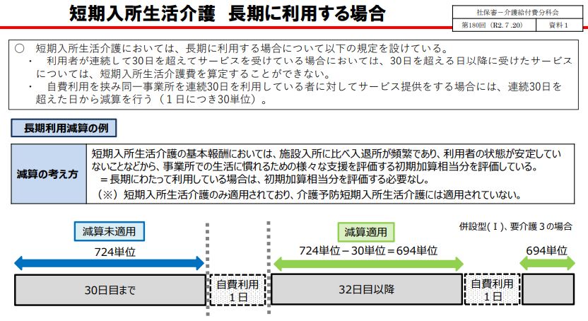 連続30日を超えて長期にショートステイを利用する場合、30日を超える日以降の介護報酬算定はできないが、自費利用を挟み同一事業所で引き続き連続30日を繰り返して利用する場合には、1日につき30単位の減算を適用して算定が可能になる=資料=。